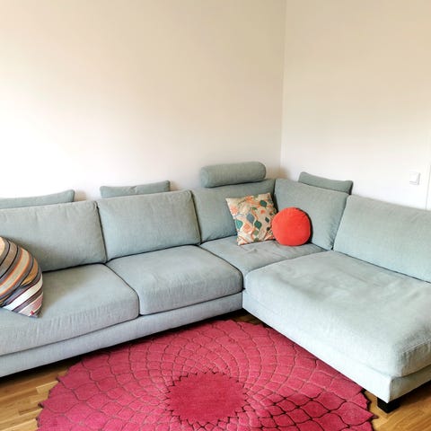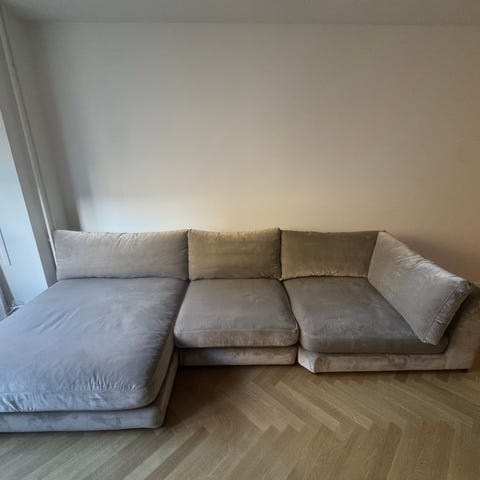 Sweef Mammut modulsoffa ljusblå klädsel, färgkod: Mint Mood 700. Soffan har generös sittyta med divanliknande avslutning och lösa ryggkuddar. Tyget är i slitstark sammet och går att dra av och tvättas. Soffan är cirka 1 år gammal. Divan-delen är 150 cm djup. Originalpris: 26 400 kr