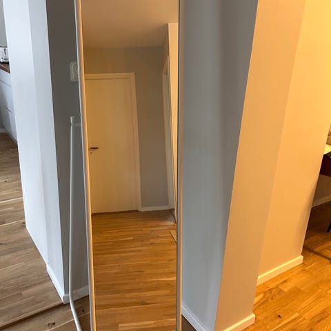 Classic IKEA KNAPPER Floor mirror, the mirror is 38 cm * 138 cm. This mirror has both hooks and a rod on the back. Practical if you want to hang up tomorrow's outfit and treat yourself to a few extra minutes under the covers.