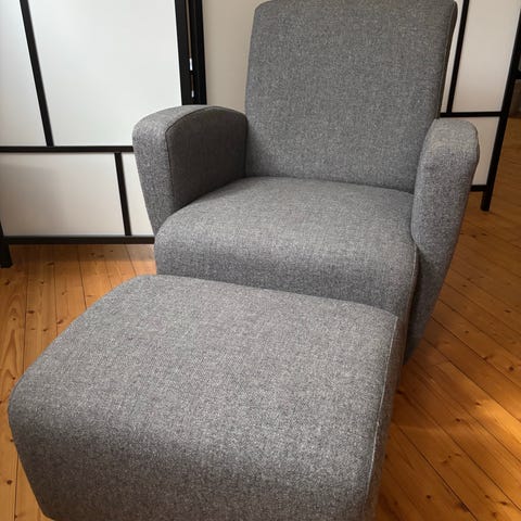 Två mörkgråa fåtöljer med fotpallar i fint skick.