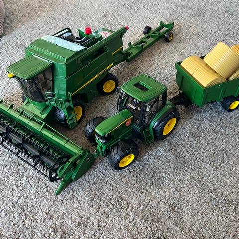 Bruder leksakstraktor med vagn och redskap i grön plast. Setet består av en traktor med drag, en tippvagn och ett extra jordbruksredskap. Traktorn har detaljerade hjul, hytt och front, och vagnarna kopplas på bakom traktorn. Lämplig som leksak för barn som gillar lantbruk och fordon, samt för inomhuslek på golv eller liknande ytor.