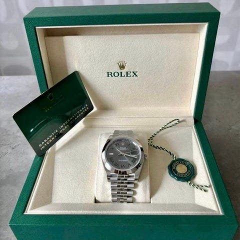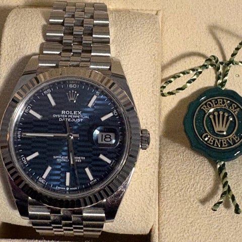 Säljer en helt ny, oanvänd Rolex Datejust 41 uttagen 2026-01 Klockan är i absolut nyskick, aldrig använd, inga märken eller repor.