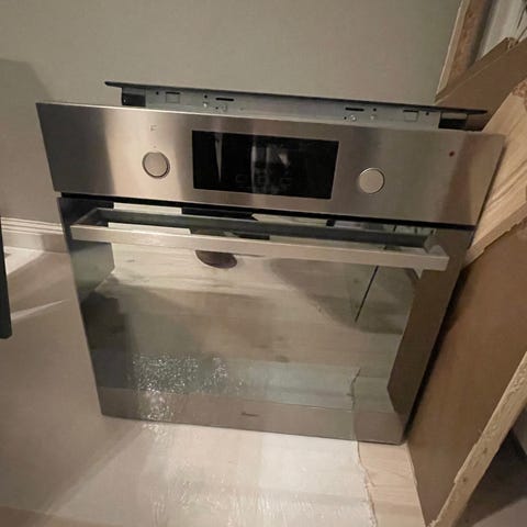 Inbyggnadsugn i rostfritt stål, frontpanel med tre vred för inställning av värme och funktioner samt ugnslucka med handtag. Säljes pga renovering.
