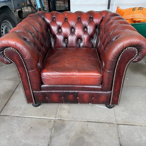 Nätt och lagom stor clubfåtölj i Chesterfieldstil. Oxblodsröd läder/skinn.