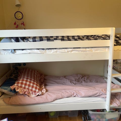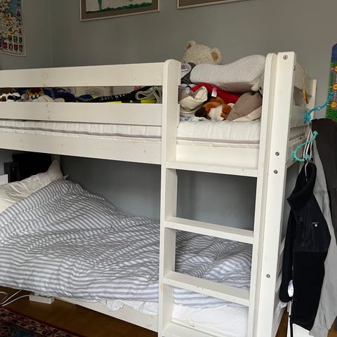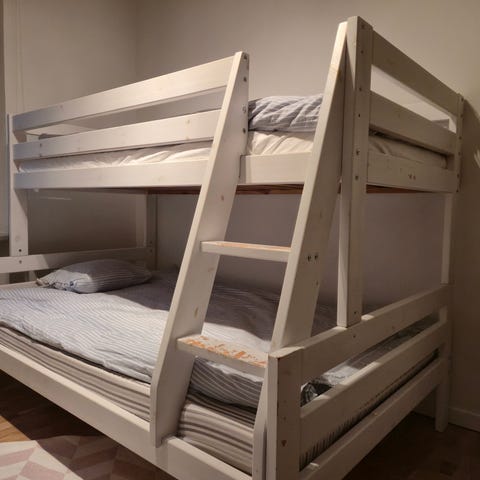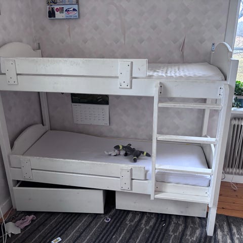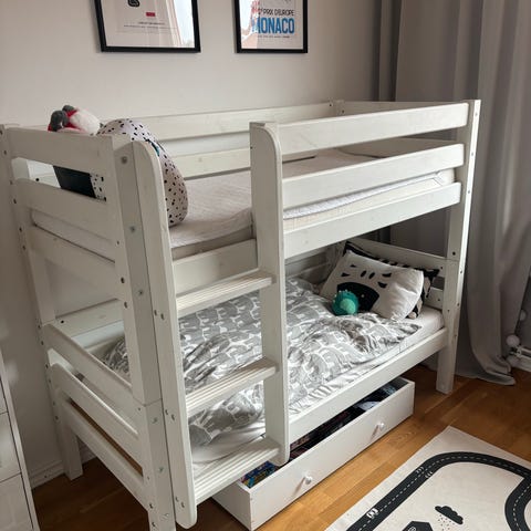Vit våningssäng enligt bild. Normalt siltage. Står den inte dikt mot väggen är den lite ranglig när man klättrar upp i den. Men det bör vara lätt att åtgärda. Madrasser medföljer om man vill. 207 cm lång, 154 cm hög, 100 cm bred (som bredast vid trappan). Katt i hemmet. Finns i Jordbro