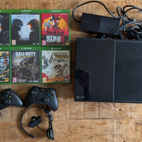 Microsoft Xbox One spelkonsol i svart utförande tillsammans med två trådlösa handkontroller, strömadapter samt HDMI‑kabel. Två spel på skiva medföljer.
