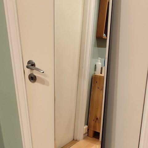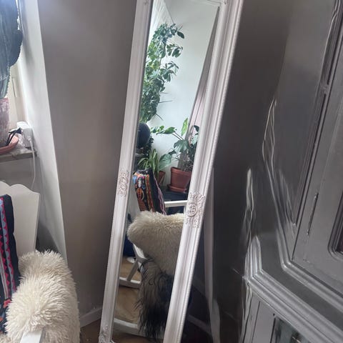 Ramen är synligt limmad på flera ställen (se bilder) men är stabil. Går nog att spackla/måla om för att få den fin.