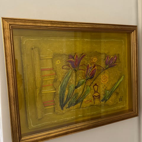 Denna tavla är upcyclad från Stadsmissionens second hand och har fått nytt liv genom ett konstnärligt lager-på-lager‑uttryck. I bakgrunden kan man ana den ursprungliga målningen med rosor, som subtilt skymtar fram och skapar djup och historia i verket.