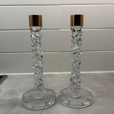 Orrefors ljusstakar i klart glas med mässingsfärgade ljushållare. Ljusstakarna har rund fot i glas och en dekorativ, strukturerad glaspelare. Passar för vanliga kronljus och kan användas som bordsdekoration eller inredningsdetalj i hemmet.