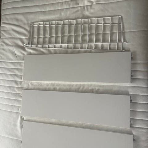 4 vita stringhyllor med tillhörande ”krokar” (en har en liten naggning, se bild)