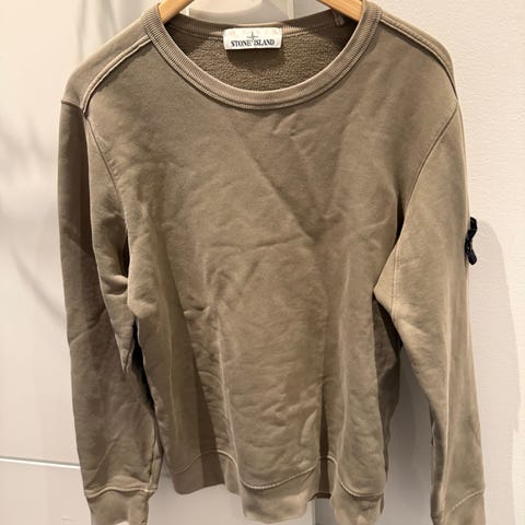 Stone Island tröja för herr i storlek M. Tröjan är brun och tillverkad i bomull. Den har lång ärm, rund halsringning och avtagbar logotyp-patch på ena ärmen. Passar som vardagströja eller som ett extra lager under jacka.