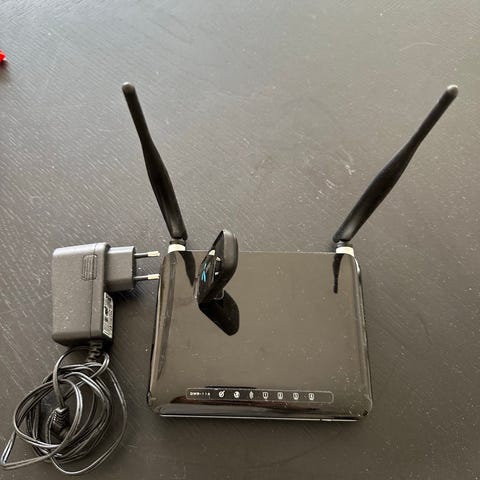 Router i svart färg med två externa antenner. På baksidan finns flera nätverksportar samt anslutning för strömadapter. Passar för trådbundet och trådlöst nätverk i hem- eller kontorsmiljö.