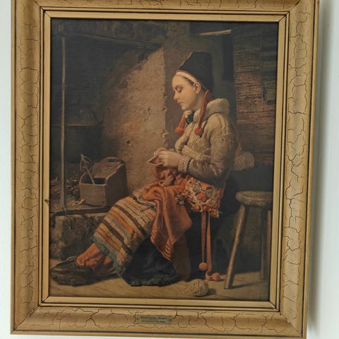 Konsttryck tavlor med motiv av människor i färgstarka landskap. Båda verken är inramade med bred guldfärgad ram och vit passepartout. Motiven föreställer dels en cykelscen på landsväg i dagsljus, dels ett par vid en grind i kvällsmiljö. Passar som väggdekoration i vardagsrum, hall eller sovrum.