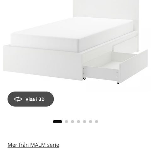 IKEA Malm sängram med förvaring i vit färg. Sängramen har hög gavlar och utdragbara lådor under sängen som ger extra förvaringsutrymme för till exempel sängkläder eller kläder. Passar standardmadrass i motsvarande storlek enligt IKEA:s Malm-serie.