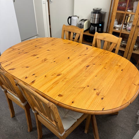 Matgrupp bord och 3 stolar trä och tyg