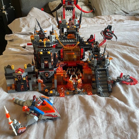 Säljer det maffiga vulkanslottet från Nexo Knights. Ett imponerande bygge med massor av rörliga funktioner och detaljer som ett roterande lavahjul som man trillar ner till genom en fallucka. Väggar som öppnas, såghjul osv.