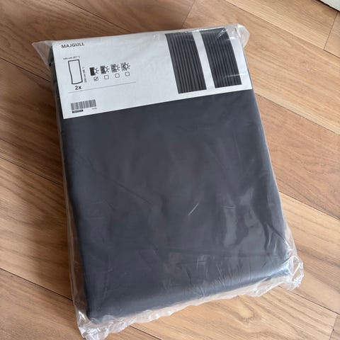 IKEA gardin i mörkgrå färg som stänger ute ljus effektivt (lite ljusare/blåare kulör än bilderna från hemsidan - den här färgen säljs nämligen inte längre). Gardinen har upphängning med hällor för gardinstång. Passar för användning i vardagsrum, sovrum eller andra rum där man vill skärma av ljus och insyn. Säljs i förpackning som på bild.
