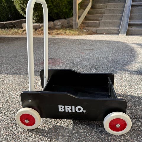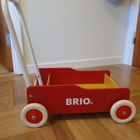 BRIO gåvagn i röd och gul färg med vit metallbygel och vita hjul. Klassisk modell för små barn som stöd vid de första stegen och som leksaksvagn att lasta leksaker i. Passar för inomhusbruk på plana golvytor.