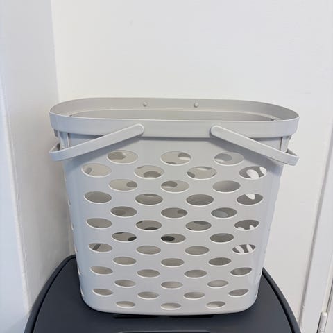 Cremevit tunna i metall för förvaring av tvätt eller annat.