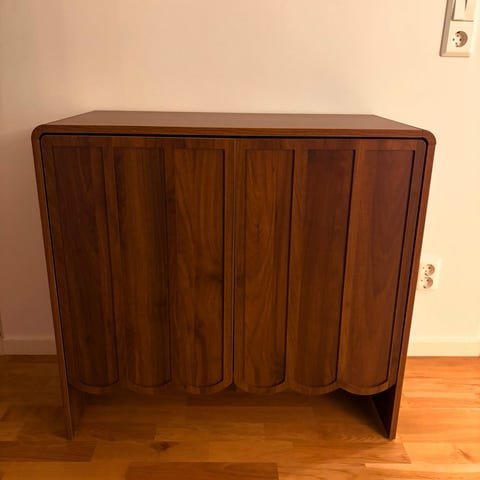 Valnöt, bra skick, några mindre repor som syns om man tittar noga. Kamoufleras annars av träets ådring.