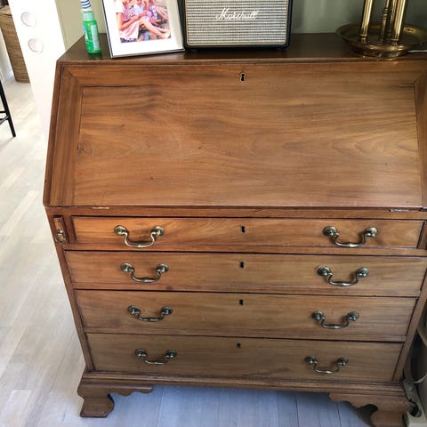 Skrivbord i trä med grön läderklädd skrivbordsskiva och flera lådor på båda sidor samt mittlåda. Till skrivbordet hör en kontorsstol med armstöd i trä och grön, knapptuftad läderklädsel på sits och rygg. Möbelgruppen är lämplig för hemmakontor eller arbetsrum och erbjuder gott om förvaringsutrymme i lådorna samt en stoppad stol för längre sittande.