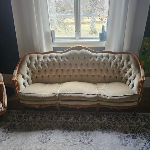 Soffgrupp i ny rokoko stil bestående av en 2-sits soffa och två fåtöljer. Träram med snidade detaljer och stoppad sits med resor och rygg. Klädsel i mönstrat, guldfärgat tyg med djuphäftad rygg. Viss slitage något hål och fläckar på tyget och förekommer enligt bilderna.