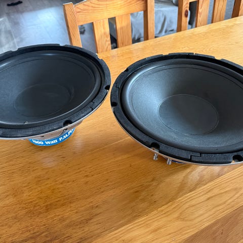 Rejäla 12-tummare som tillfälligt användes i mina Pioneer hpm 900 men gav för mycket bas för min smak. 40oz strontium magnet och djup bas, ända ned till 25Hz. Se bilder för data/märke. Nypris 1400kr, nu 400kr paret.