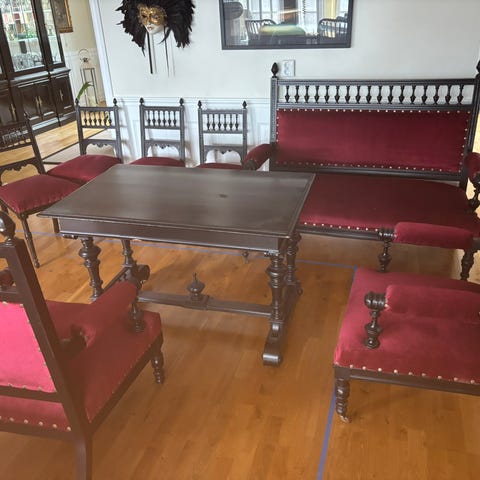 Salongsgrupp med stolar i röd sammet. Samt gungstol.