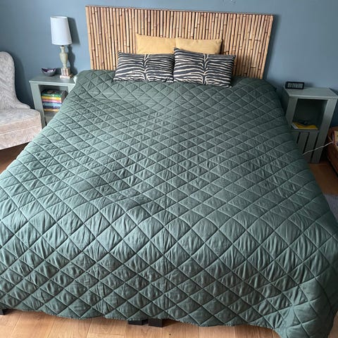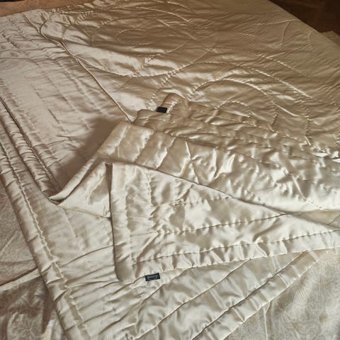 överkast med mönstrat flerfärgat tyg på ovansidan och quiltad undersida. Passar som sängöverkast.