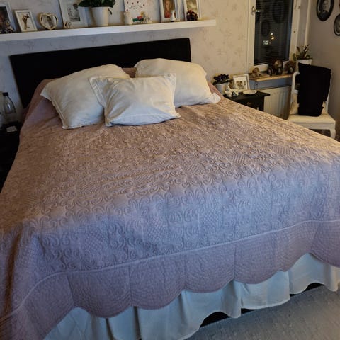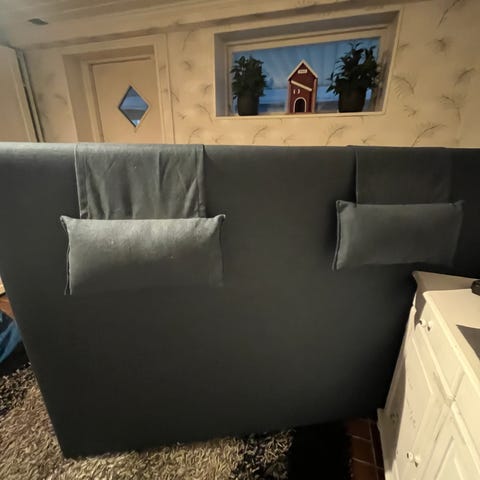 Lite streck syns på sammetstyget på bilderna, men det är streck bara efter dammsugning - det är bara att stryka med handen över sammeten så är strecken borta. Sänggaveln är inte vägghängd utan den står på golvet. Katt har tidigare funnits i hemmet. Sänggaveln finns i Farsta.