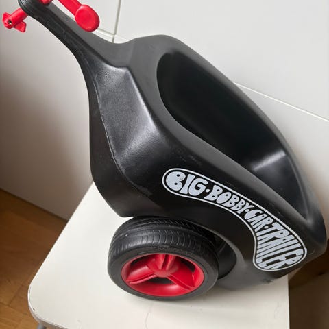 Röd Bobby Car med släp i ok skick. Saknar piggen till dragkroken, så vi har kört med ett snöre. Annars i fint skick.