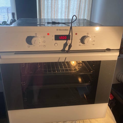 Electrolux inbyggnadsugn med varmluft i vit färg. Ugnen har vred för inställning av temperatur och ugnsfunktioner samt en liten display i mitten för tids- och funktionsvisning. Insidan är utrustad med fläkt för varmluft, ugnsgaller och ugnsplåtar. Passar för inbyggnad i köksskåp och är avsedd för vanlig matlagning och bakning med varmluftsfunktion.