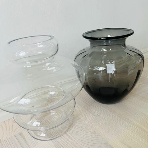 Jysk vas i genomskinligt glas. Vasen har en rundad, skulptural form med flera mjuka nivåer. Passar för snittblommor, torkade växter eller som dekoration på bord, hylla eller fönsterbräda. 100:- (349:)