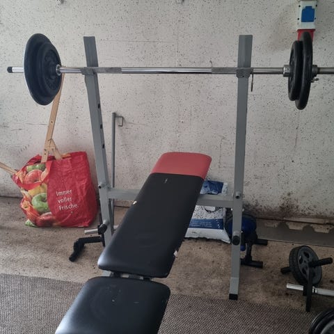 Rogue träningspaket med skivstång, vikter, bänk och ställning i svart färg. Paketet består av en skivstång för styrketräning, viktskivor upp till totalt 150 kg, en plan träningsbänk samt en ställning/rack för skivstången. Utrustningen är avsedd för styrketräning som bänkpress, knäböj och andra basövningar i hemmagym eller mindre träningsutrymmen.