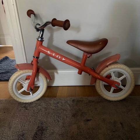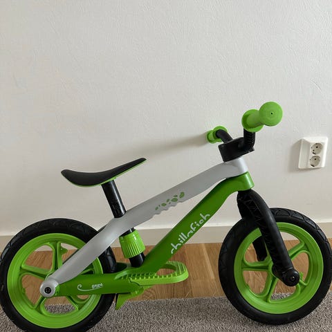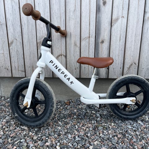 Grön balanscykel med hjulstorlek 12". Cykeln har träram i grön färg, vita däck och sadel i brun nyans. Passar för barn som ska träna balans och lära sig cykla utan pedaler. Lite använd så i mycket fint skick.