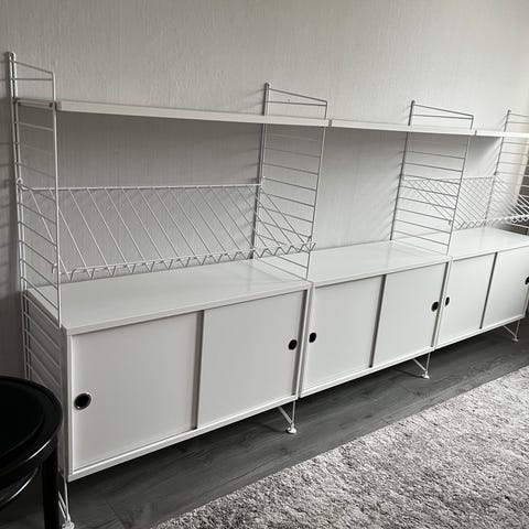 Stringhylla med två lådhurtsar, nio hyllor och tre golvgavlar i valnöt.
