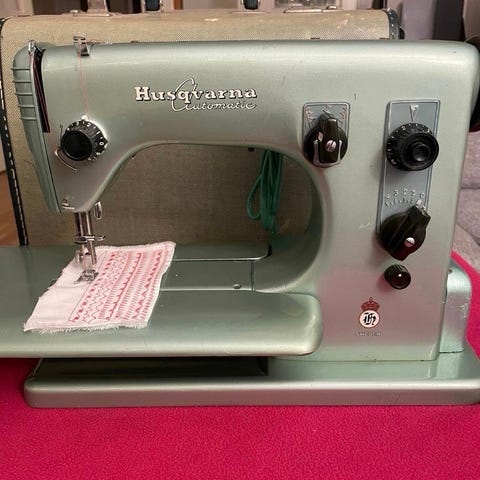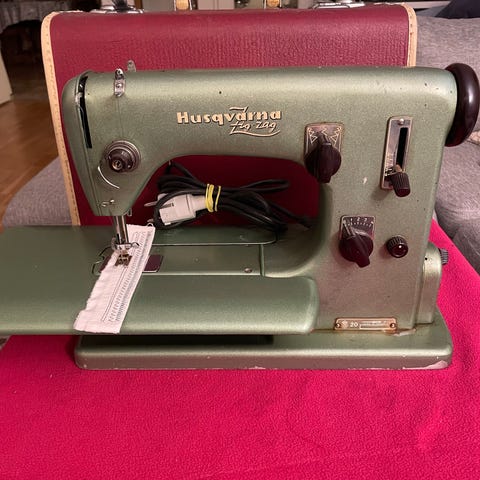 Husqvarna symaskin i grön metall med mekaniska reglage. Maskinen har flera sömtyper, inklusive raksöm och olika sicksackmönster, vilket syns på provlappen. Pedal och elkabel ingår. Till maskinen följer även tillbehörslådor med pressarfötter, spolar och mindre syredskap. Passar för allmän sömnad och enklare textilarbeten i hemmet.ny servad fungerar jättebra med alla tillbehör