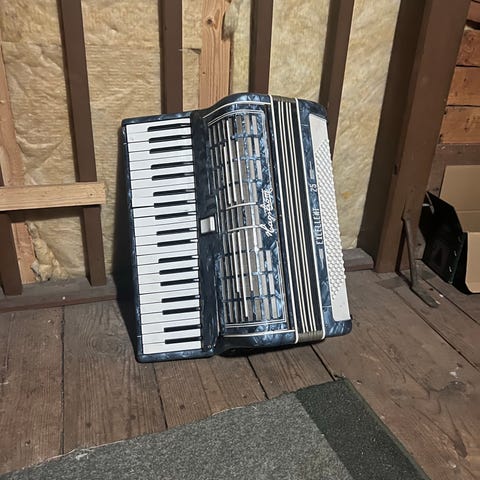 Dragspel knappdragspel i brun färg med många registerknappar på båda sidor. Instrumentet har bälg med dekorativa detaljer och axelrem för att kunna spelas stående eller sittande. Passar för spel av traditionell folkmusik och annan akustisk musik där ett knappdragspel önskas.