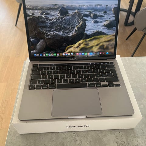 Apple MacBook Pro laptop med 13-tums skärm i grå färg. Datorn har bakbelyst tangentbord, stor styrplatta och inbyggd webbkamera. Levereras med originalkartong och nätadapter med laddkabel. Lämplig för vardagsbruk, studier och kontorsarbete.