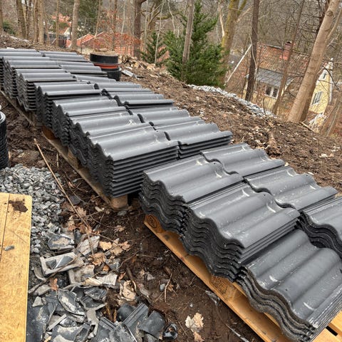 Monier Jönåker takpannor i betong, grå färg. Levereras buntade på pall enligt bild. Passar för yttertak på bostadshus, garage eller andra byggnader anpassade för denna typ av betongpanna. Profil och utförande enligt Monier Jönåker-serien, lämplig både för nyläggning och utbyte av befintliga pannor av samma modell.