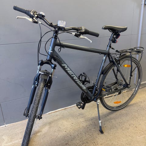 RD hybridcykel med ramstorlek M. Cykeln har rakt aluminiumstyre och barends med vridreglage för 21 växlar, handbromsar samt stänkskärmar fram och bak. Passar för pendling och vardagscykling på väg och cykelbana. Blocklås med nyckel samt stöd. Passar cyklist som är 160-180cm. Nyservad av erfaren cykelmekaniker, priset kan diskuteras vid smidig affär.