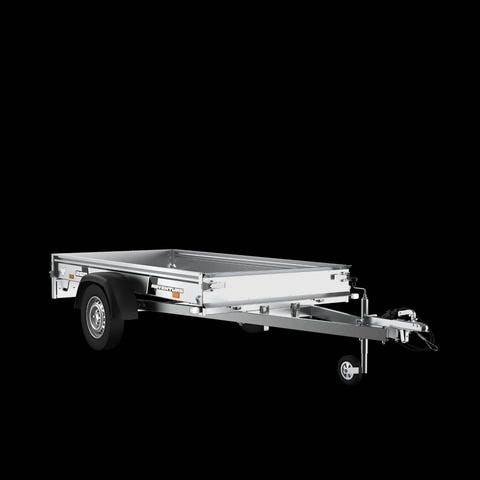 Trailermate-släp med bromsar. Om du behöver en vanlig, men högkvalitativ, prisvärd och över 1000 kg tung trailer, är detta den! De fyrbladiga fjädrarna och stötdämparna säkerställer utmärkt lastkapacitet och körkomfort. Fram- och baksidorna är förstärkta med vattenplywood. Det finns 8 lastfästningsöglor på botten och 6 svetsade öglor på utsidan. Bensinfjädertipparen och bakdelen på det mångsidiga släpet fungerar som hjälpmedel vid lastning.
