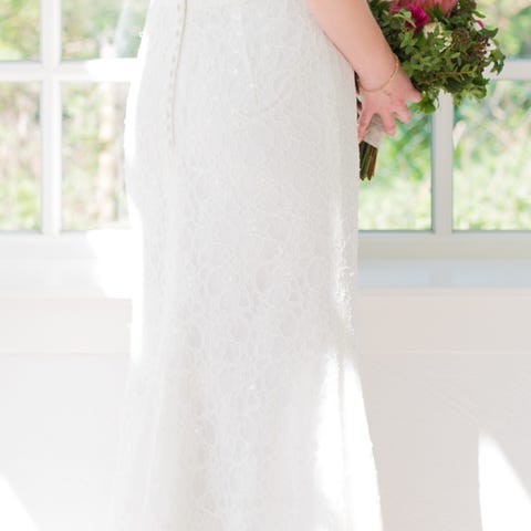 Brudklänning från Lilly i storlek 38 (bruden på bilderna är 169 cm) med spetsmönster, vid kjol och klädda knappar i ryggen.