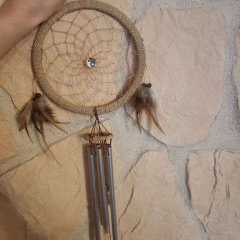 En unik drömfångare med virkad kvadratisk ovandel och svajande fjädrar med pärlor nedtill.