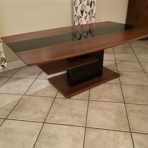 Fint soffbord i lackat, ljus ek med keramikplattor. Använd men i fint skick. Hämtas i centrala Varberg.