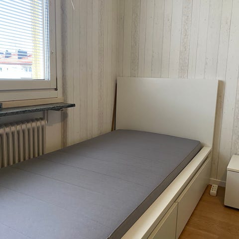 IKEA säng med förvaring i vit färg. Sängen är utformad som en enkelsäng med madrass ovanpå en sängstomme som har inbyggd förvaring i form av utdragslådor under liggytan. Passar till sovrum, gästrum eller tonårsrum där man vill kombinera sovplats med extra förvaringsutrymme för exempelvis kläder, sängkläder eller andra tillhörigheter. Mått på ramen: 98x208. Passar alltså 90x200madrass.