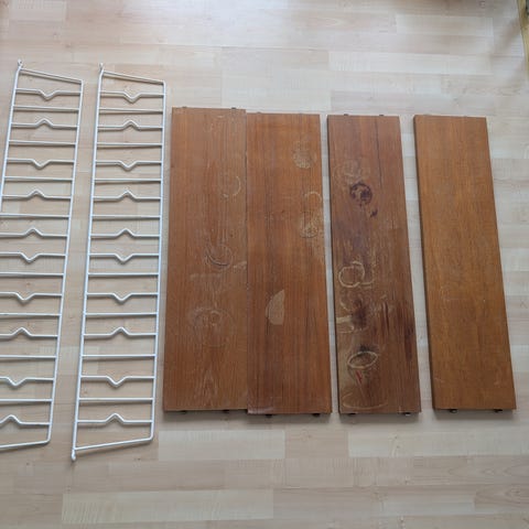 Säljer en tidlös stringhylla med tre hyllplan i mörkt trä (troligtvis teak eller mahogny) och vita gavlar. En riktig designklassiker som passar perfekt i allt från köket till vardagsrummet.