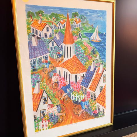 Stina Sunesson tavla med brudmotiv i blommande landskap. Bilden visar en brud i vit klänning omgiven av blommor i förgrunden, med åkrar, hus och berg i bakgrunden. Verket är daterat Tällberg 1976 och är signerad Stina Sunesson. Tavlan är inramad med passepartout och ram i guldfärg. 217/360