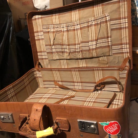 Resväska i vintage-stil i brun färg. Klassisk hård modell med metallbeslag, nitar och bärhandtag på ovansidan. Passar som resväska, förvaring eller inredningsdetalj. Ytan visar tydliga bruksspår och äldre reseetiketter, vilket ger ett patinerat utseende.