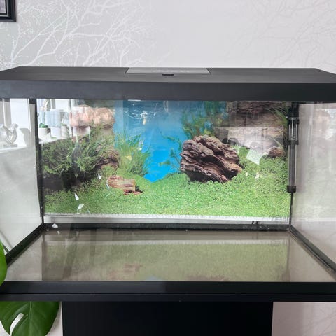 54 liter Aquael akvarium med svart lock. Passar för sötvattensfiskar och kan placeras på bänk eller skåp.