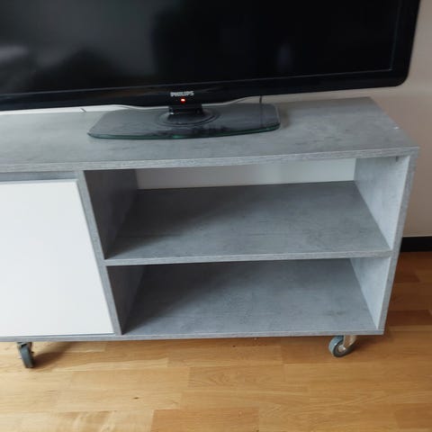 Tv-bänk med öppna hyllplan och en låda. Stomme i mörklackerad metall och skiva samt lådfront i trä. Passar för tv, mediautrustning och förvaring i vardagsrum eller liknande utrymmen.